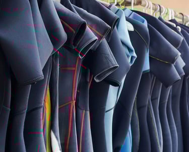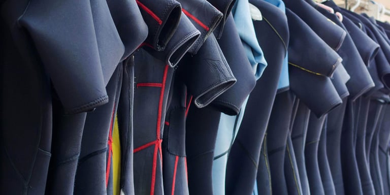 Wetsuit: Made of neoprene, it traps a thin layer of water between the suit and the skin, which is warmed by body heat.