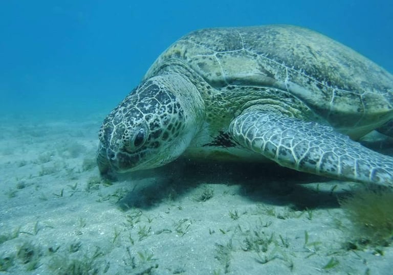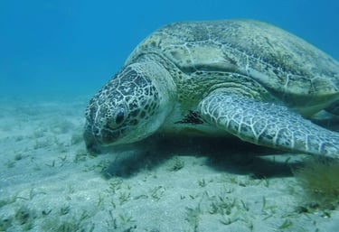 A large, herbivorous sea turtle with a smooth, brownish shell, commonly found in shallow waters and coral reefs.